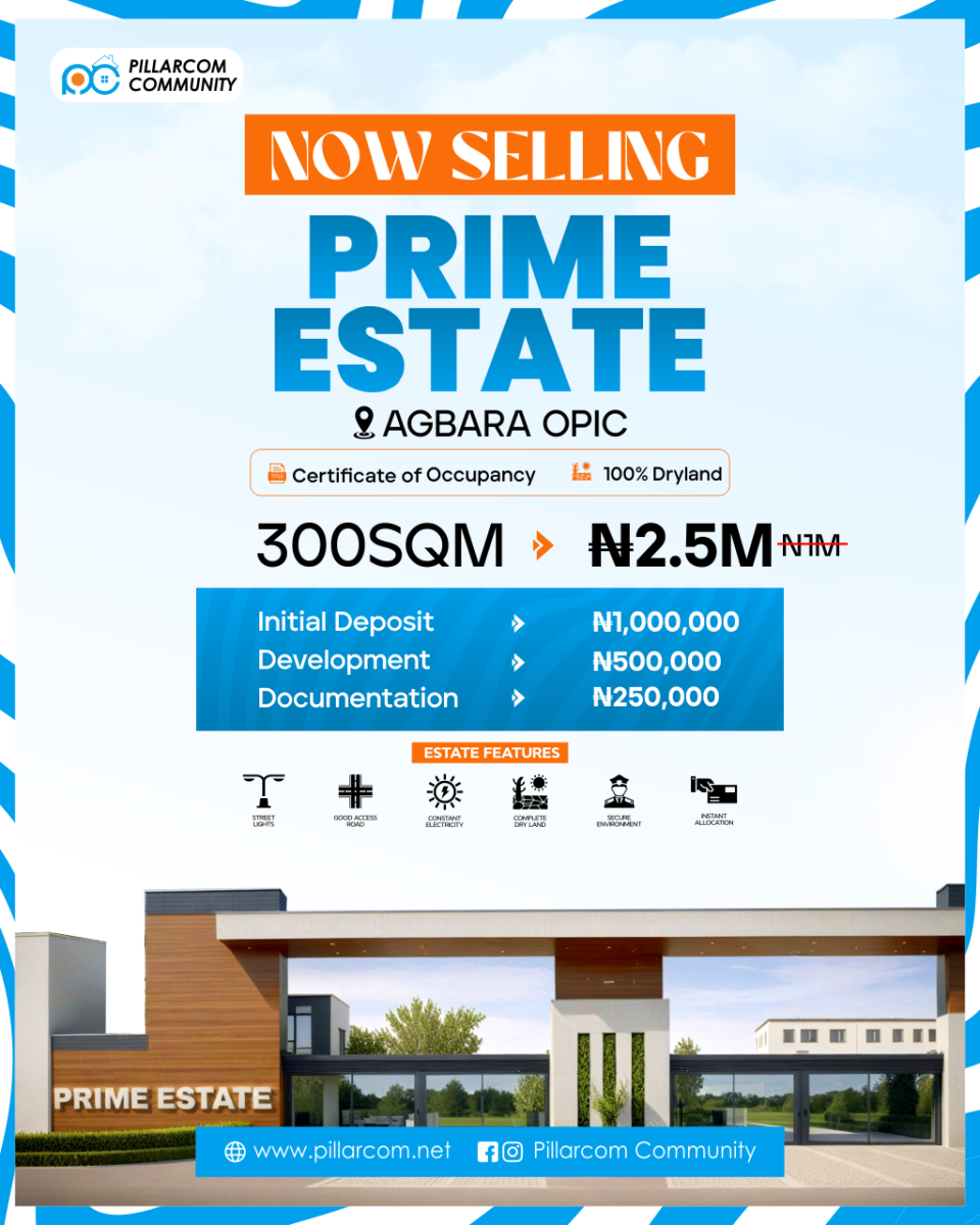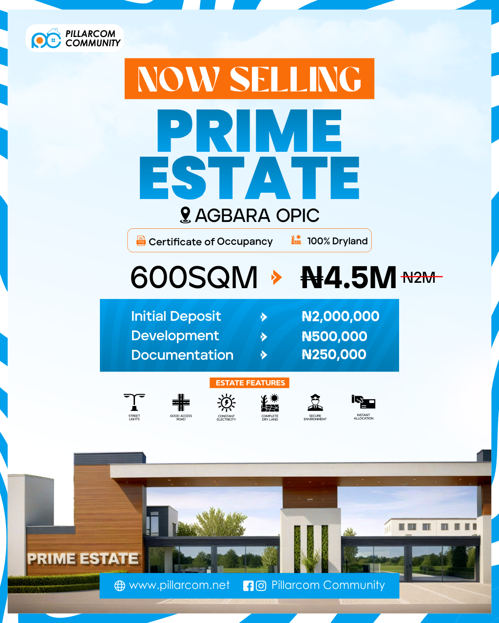 Prime Estate which located at Agbara Lusada axis is a unique one because it is just about 5- minutes drive from the major express and 3km drive away from Opic estate. Obasanjo's hatchery farm is also about 3minutes drive from the site. The land is covered with a C of O.
